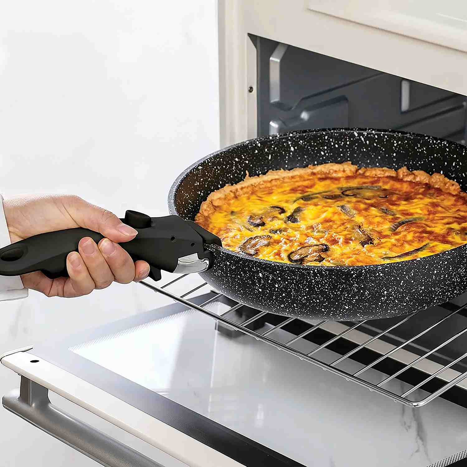 - 🚀 MANGO DESMONTABLE CON UN CLIC – Del fogón al horno (hasta 220 °C), a la mesa o al frigorífico en un solo gesto. Menos utensilios, más comodidad, más ahorro y cero quemaduras accidentales.