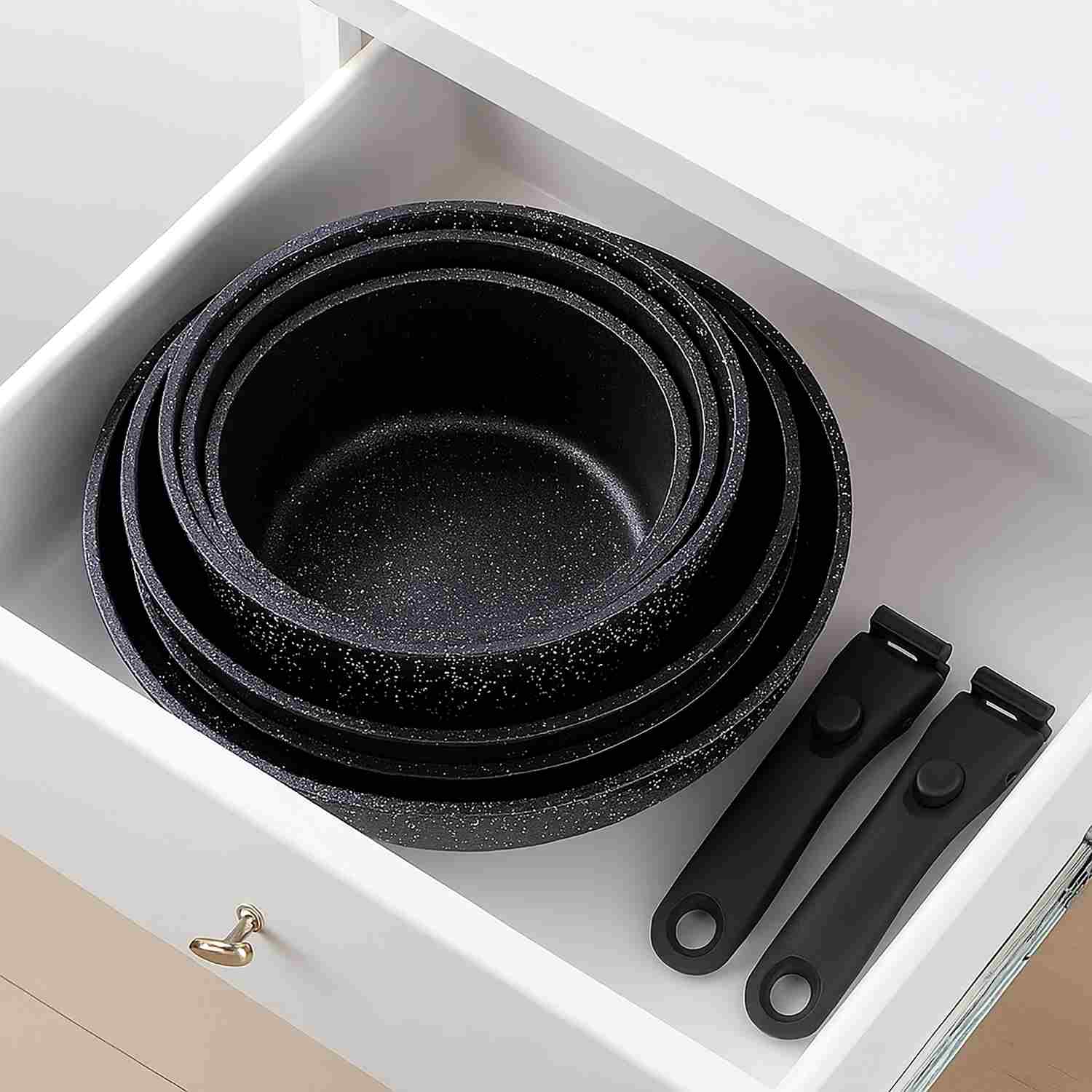 - 🏡 AHORRA HASTA UN 70 % DE ESPACIO – Todas las piezas se apilan dentro de un solo cajón gracias a los protectores incluidos; ideal para cocinas pequeñas, campers o apartamentos de vacaciones.