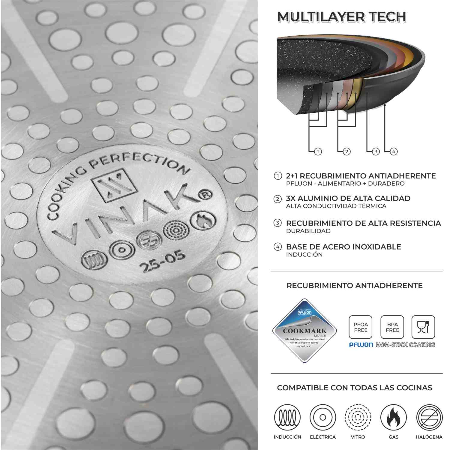 - 🍳 COCINA SIN PEGARSE – Revestimiento CERÁMICO ANTIADHERENTE COOKMARK de 2 + 1 capas, LIBRE DE PFOA Y BPA, que reparte el calor de forma uniforme y permite cocinar con apenas aceite. Limpieza en segundos: pasa una bayeta ¡y listo!