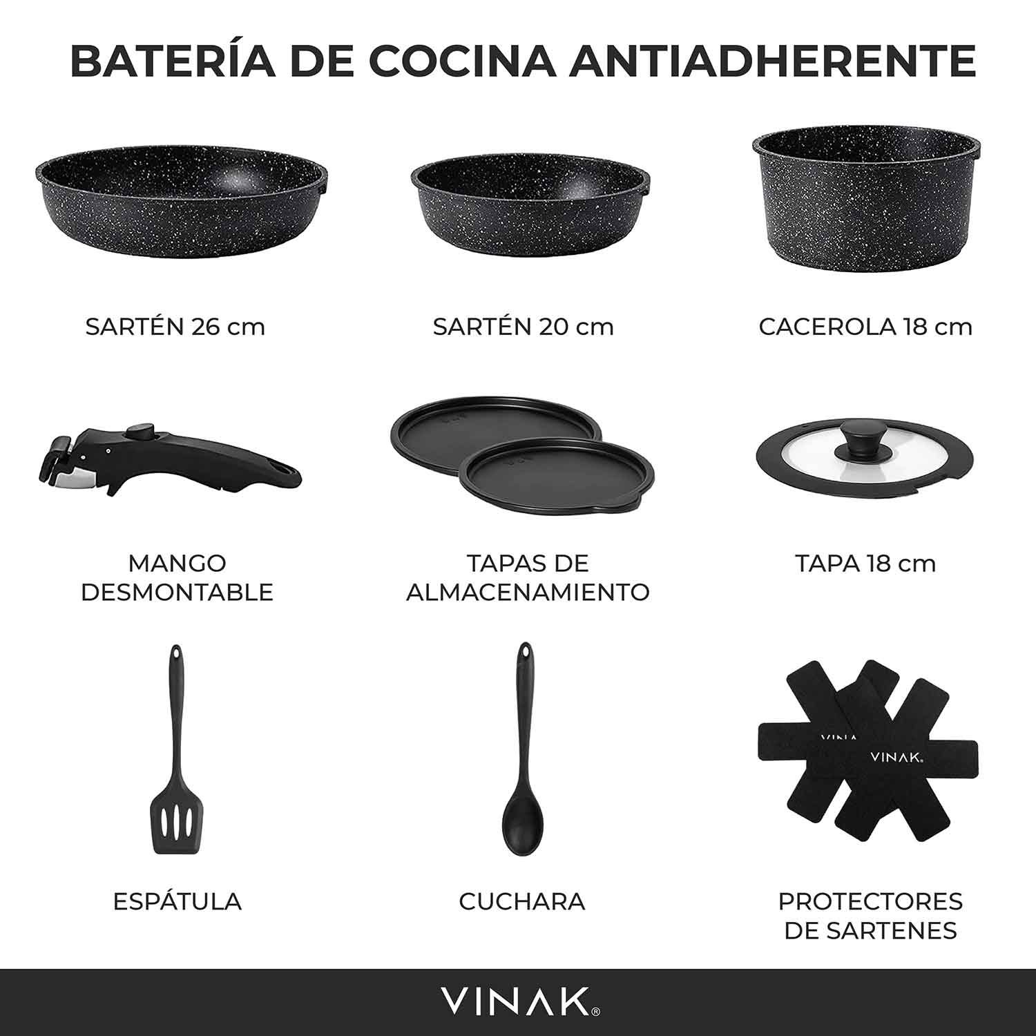 - 🔥 JUEGO 9 EN 1 TODO EN UNO – Incluye 2 sartenes (26 cm y 20 cm), cacerola 18 cm, mango desmontable, tapa de cristal 18 cm, 2 tapas herméticas, espátula, cuchara y 2 protectores: cocina, hornea, sirve y guarda sin cambiar de recipiente.